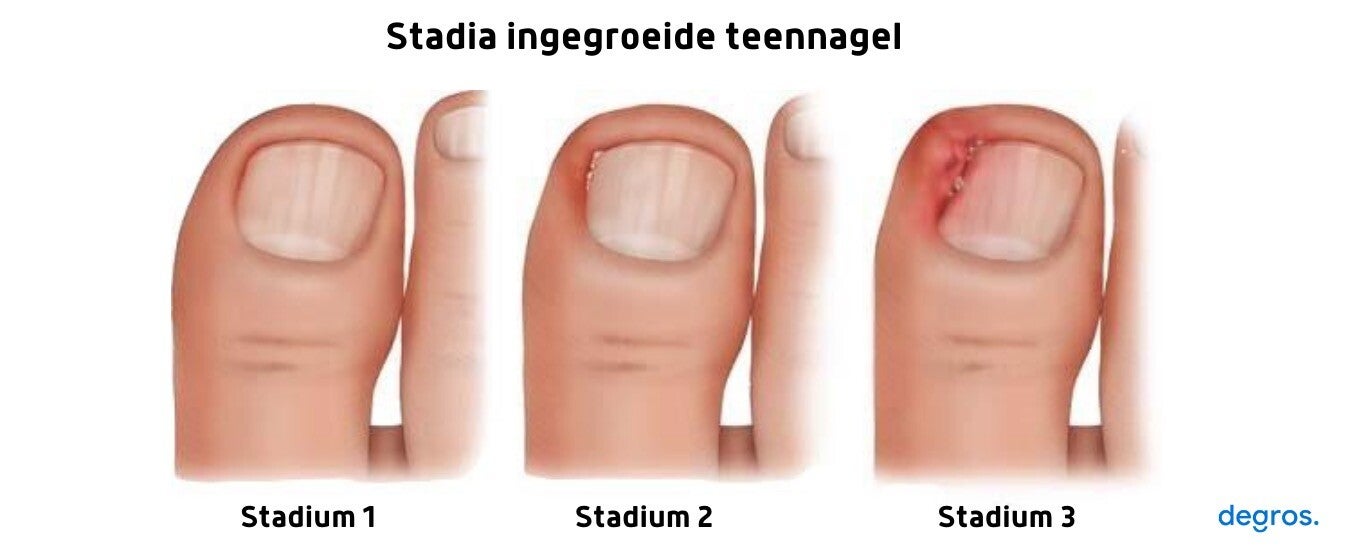 De pijn ontstaat doordat de nagelrand constant in de huid drukt, vooral bij het stappen of wanneer er druk op de teen komt.